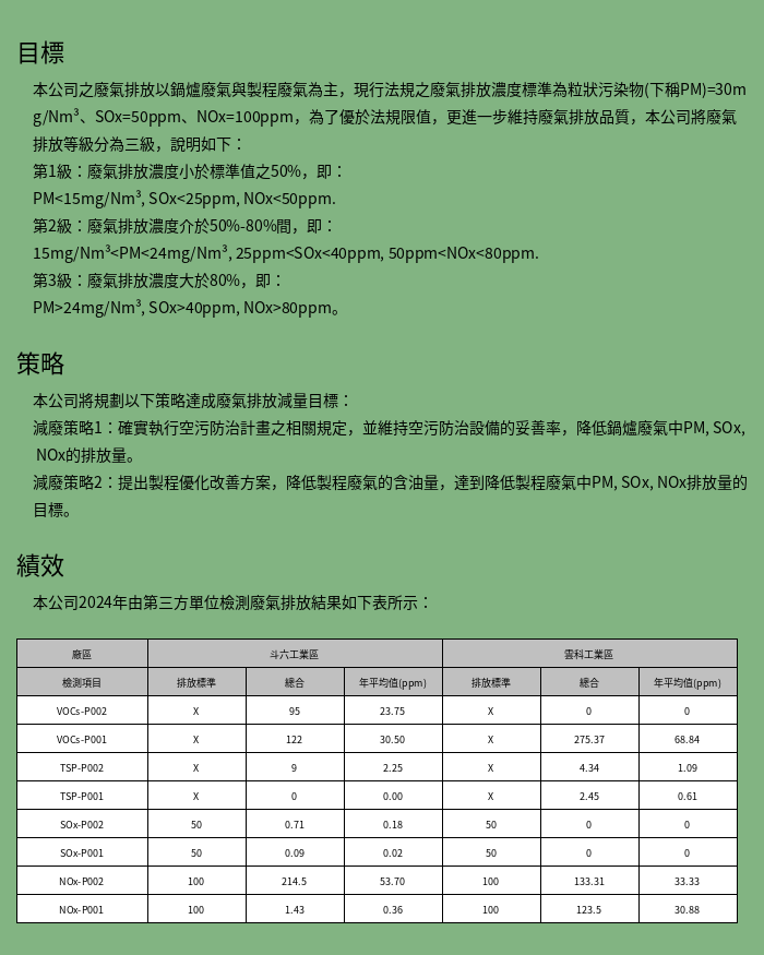 為便於全體員工、客戶與社會大眾了解本公司推動「環境管理系統」落實減廢節能之決心,以上的口號方式表達。為了本公司在綠色產品上的管理,除以上之「環境政策」口號外,本公司為符合環保法規、ISO 14001,我們以下列重點幾項,作為未來的努力方向: